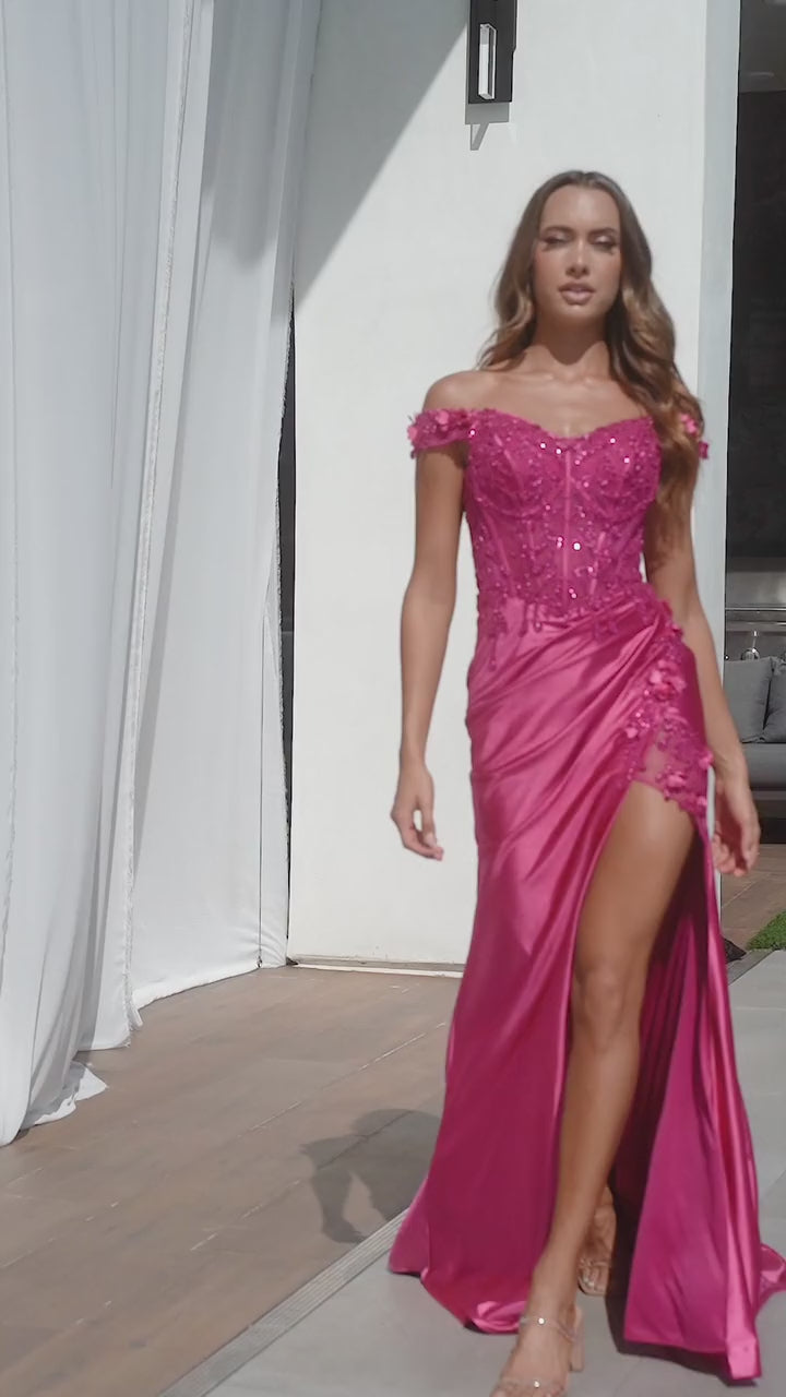 This dreamy gown features a fitted off the shoulder lace adorned bodice and floral appliques. The skirt is a gathered soft satin with high thigh slit embellished with 3D flowers and beads.