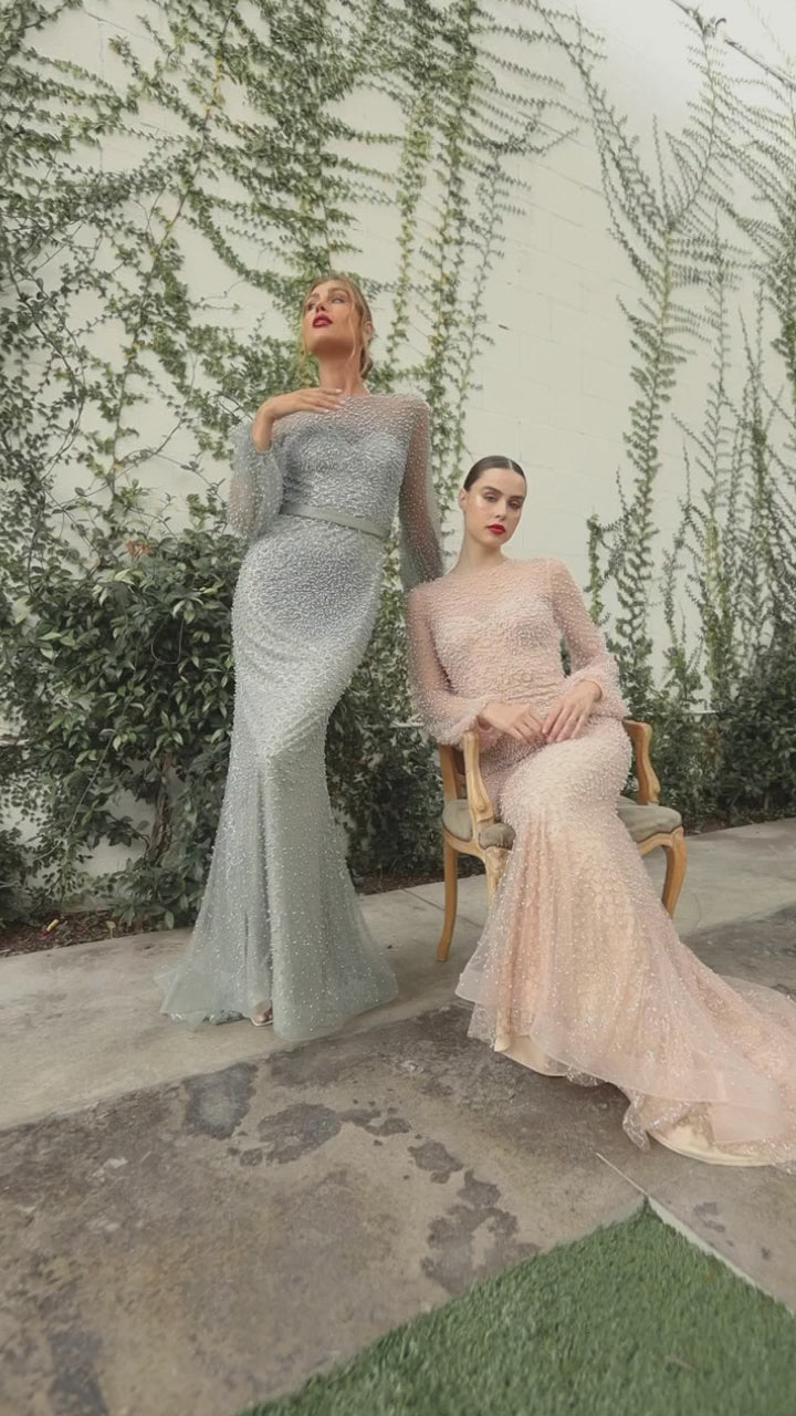 Fully Pearled Long Sleeve Fit And Flare With Gathered Sleeves Please Note All Colors Will Come With An Detachable Belt by Andrea and Leo -A0997