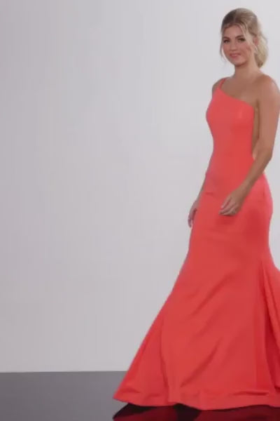 This Jovani one shoulder mermaid prom dress, featuring a fitted bodice and sweeping train, will make you the belle of the ball. The intricate lace detailing adds a touch of elegance and the curve-hugging silhouette is sure to turn heads. Steal the show in this stunning JVN06763 dress.