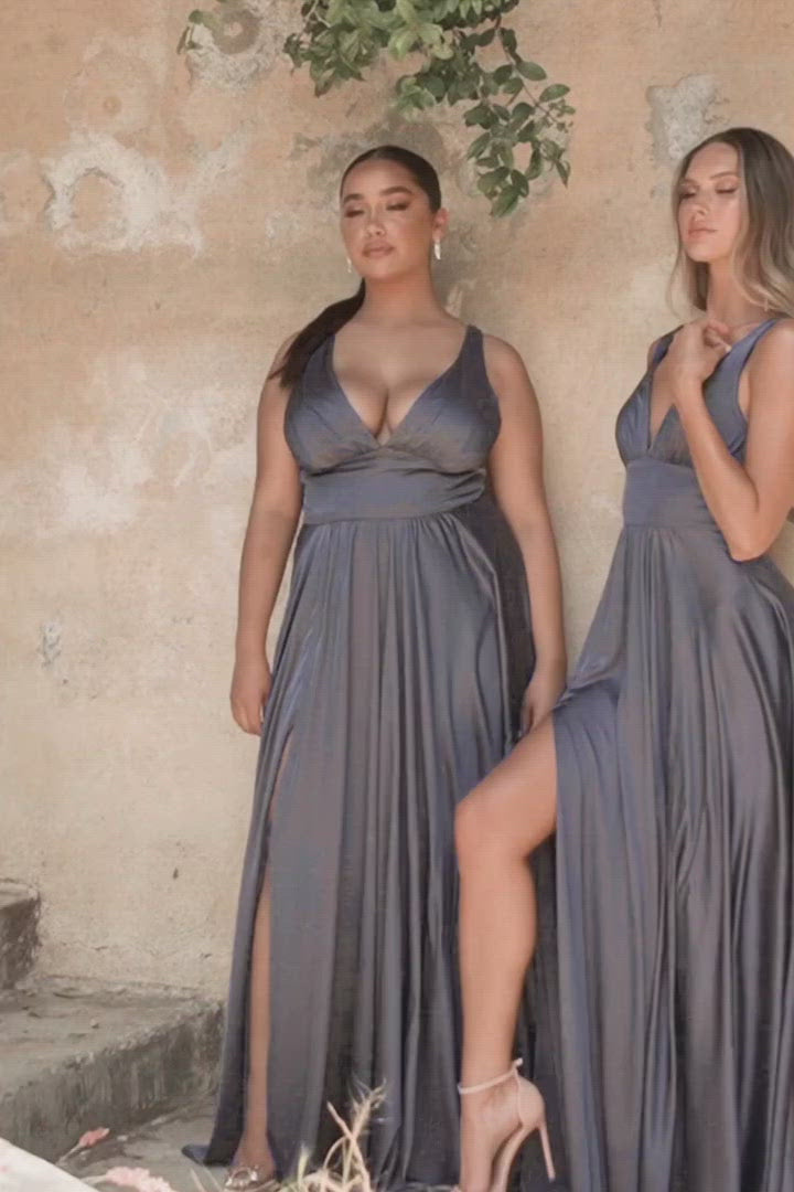 Satin Flowy A-Line Dress With Leg Slit, Open Back And V-Neckline_02 by Cinderella Divine -7469